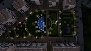 Kompleks med svømmebasseng, grønne områder, golfgreener, spa, lekeplass, bio-sunne maskiner og idrettsområder.