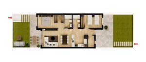 Alle boligene har privat parkering, felles svømmebasseng for voksne og barn og et flerbruksrom. Første etasje har en privat hage, mens duplex-leilighetene har store terrasser.
